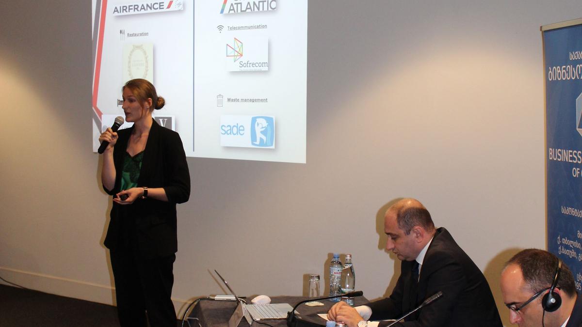 La première partie de la conférence s'est terminée par la présentation de la Chambre de commerce et d'industrie française par la directrice exécutive Sophie-Anne Godinat. Elle a présenté la Chambre comme une entité privée active en Géorgie depuis 10 ans et comptant 76 membres aujourd'hui. Elle a présenté un bref historique et a poursuivi en présentant 6 secteurs d’activité importants dans lesquels des entreprises françaises se sont distinguées récemment. Le premier secteur concerne le trafic de passagers avec la compagnie Air France qui a récemment lancé des vols directs Tbilissi-Paris, la restauration avec la compagnie La Durée, l'hôtellerie avec les hôtels Pullman présents sur le marché géorgien et l'école Vatel qui deviendra une école de formation professionnelle en Géorgie, télécommunication avec Sofrecom, l'industrie avec le Groupe Atlantic qui a récemment ouvert une usine à Kutaisi et enfin Sade avec la gestion des déchets. Tous ces secteurs d'activité témoignent du travail réussi de la chambre française sur le marché géorgien.