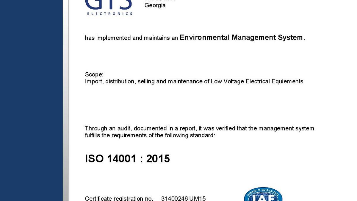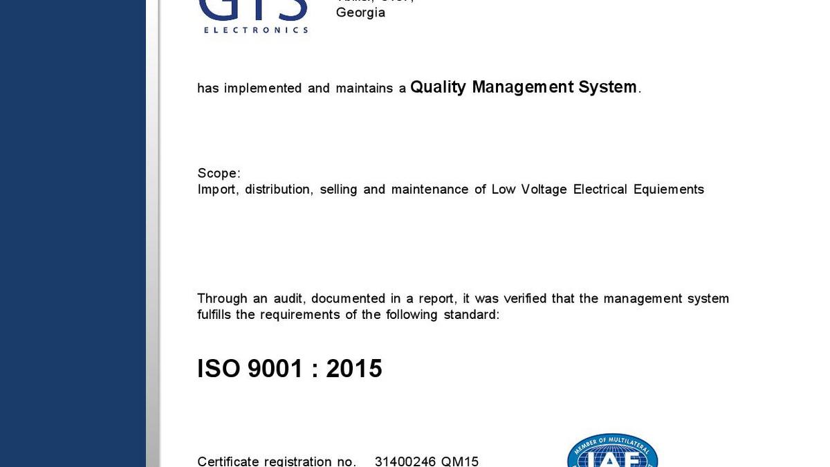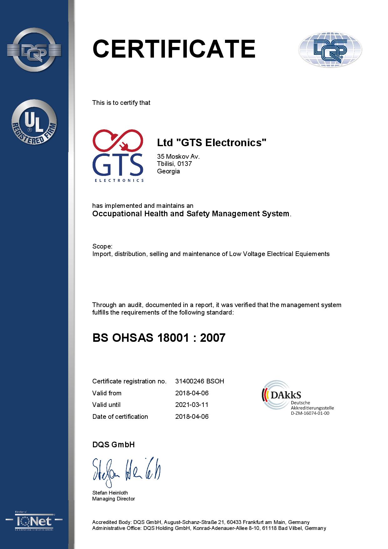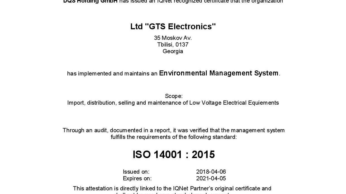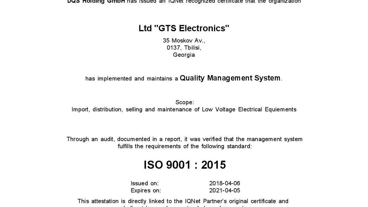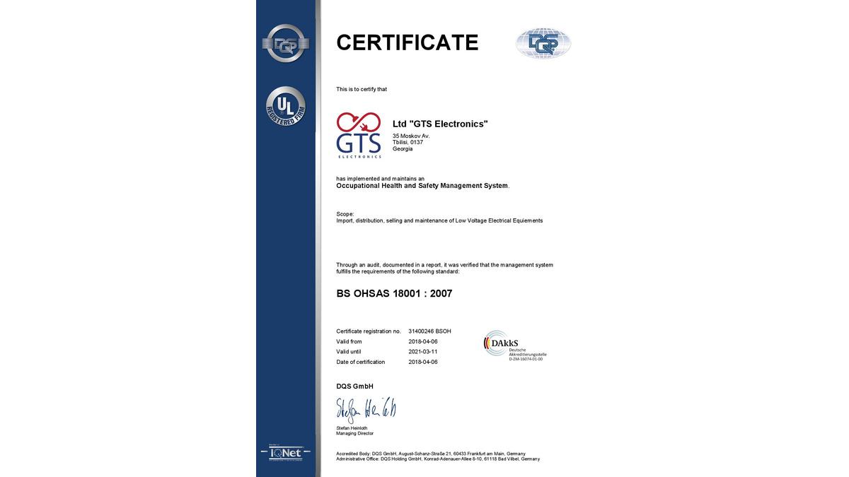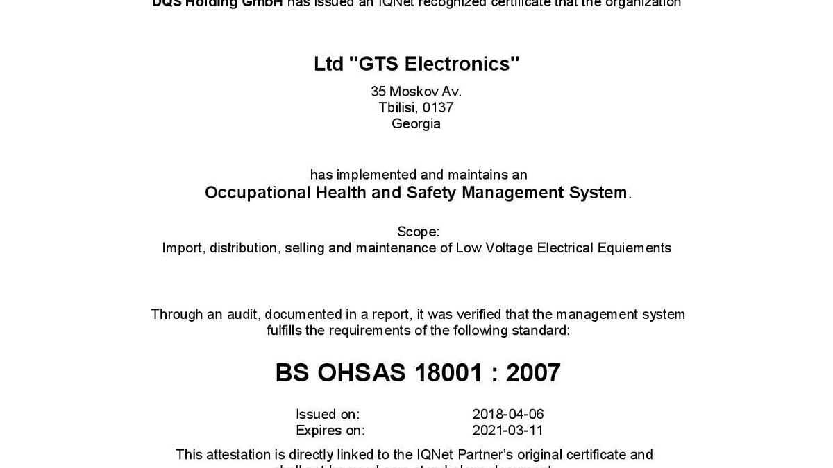 En avril 2018, GTS Electronics a reçu les certificats ISO 9001, ISO 14000, OHSAS 18000 (ISO 45001) et est ainsi devenu la première et seule société (pour le moment) à posséder simultanément les trois documents en Géorgie