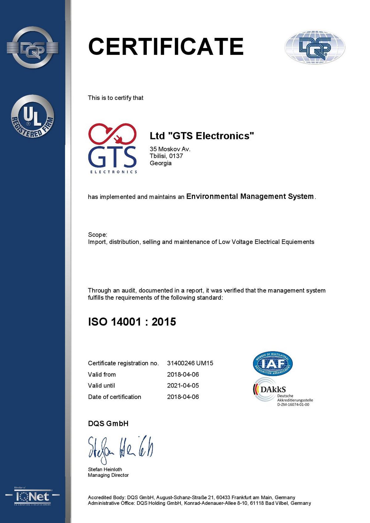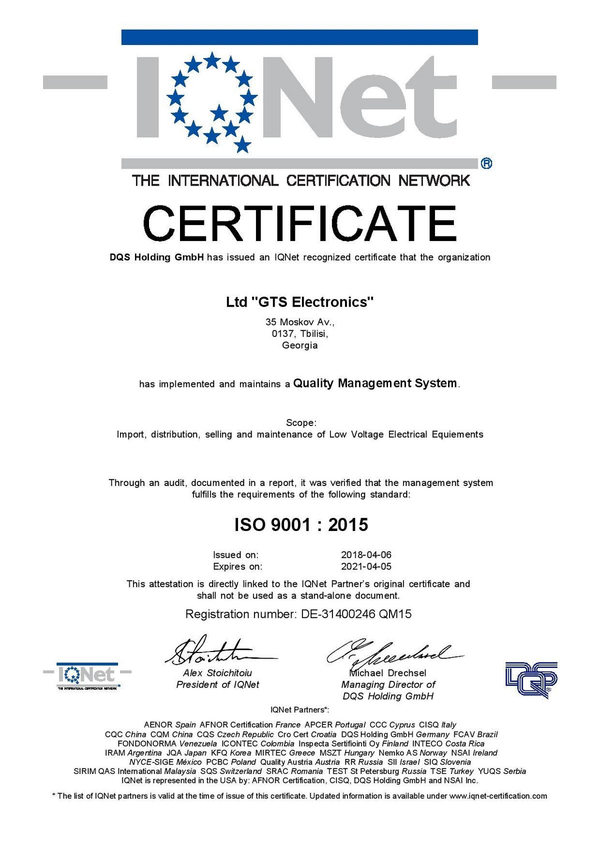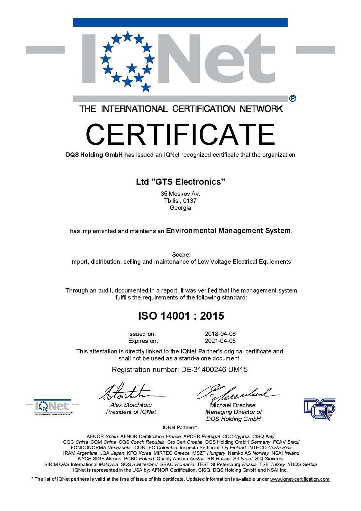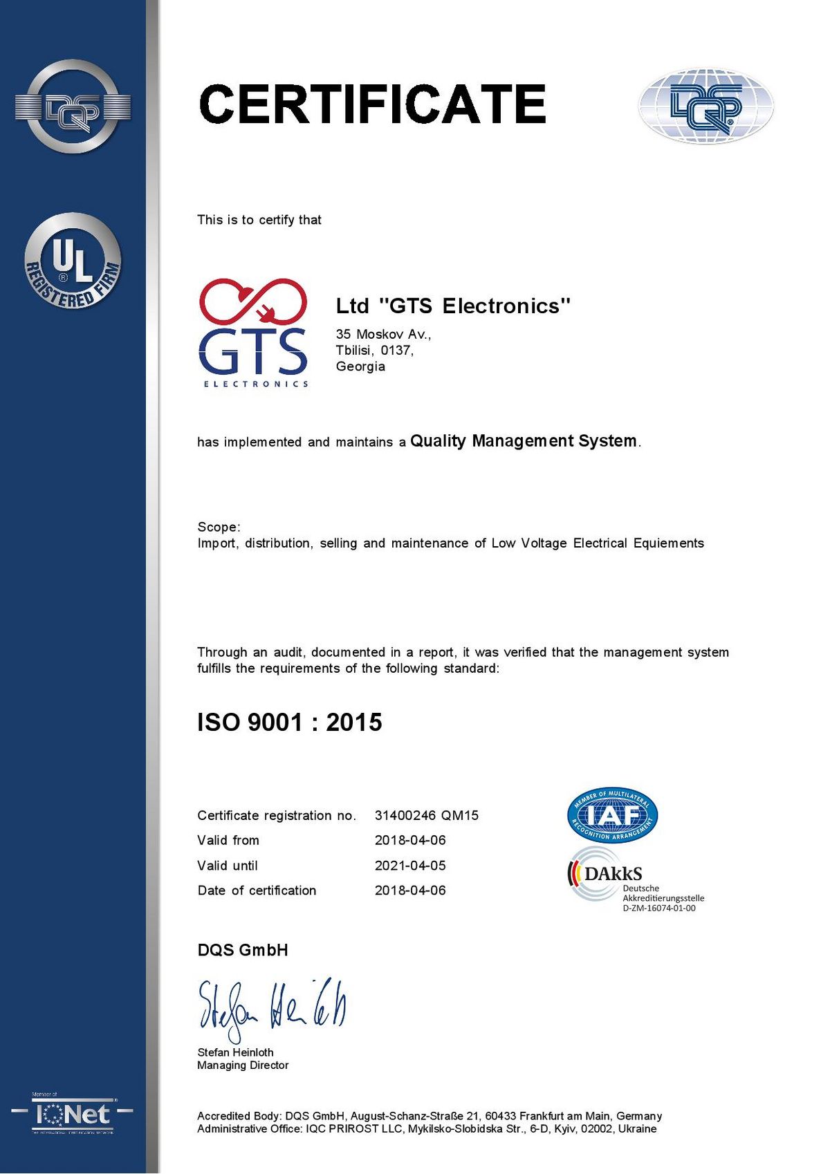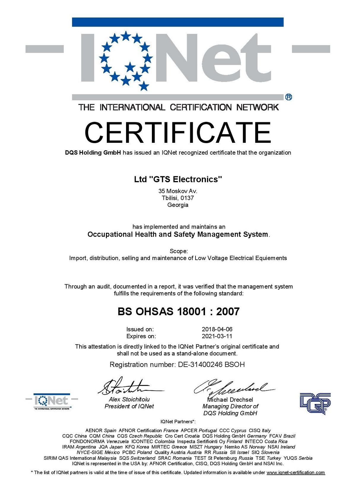 En avril 2018, GTS Electronics a reçu les certificats ISO 9001, ISO 14000, OHSAS 18000 (ISO 45001) et est ainsi devenu la première et seule société (pour le moment) à posséder simultanément les trois documents en Géorgie