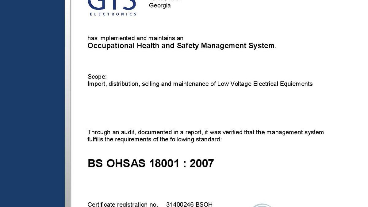 GTS Electronics - certificats ISO 9001, ISO 14000, OHSAS 18000
