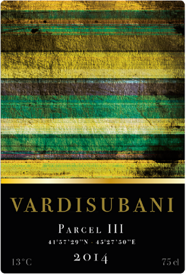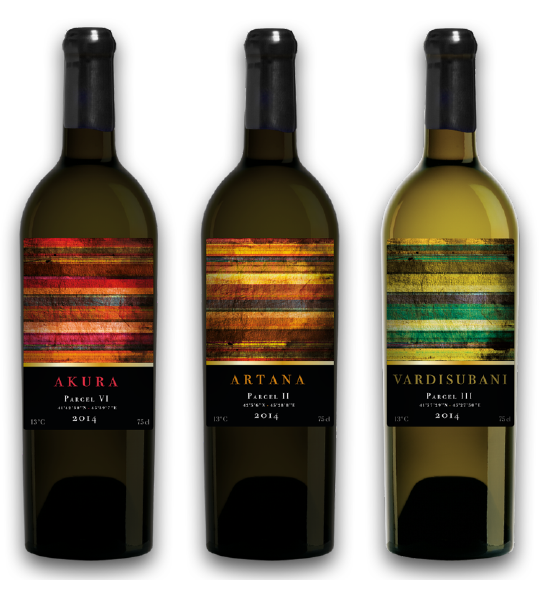 Les illustrations qui ornent les étiquettes ont été inspirées par les couleurs éclatantes des paysages géorgiens. Chaque bande représente une couche de quintessence: pays, région, terroir, parcelle.