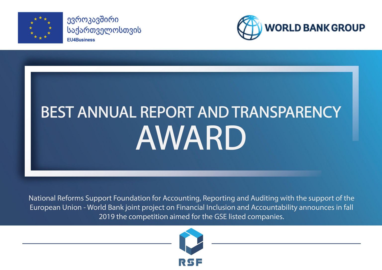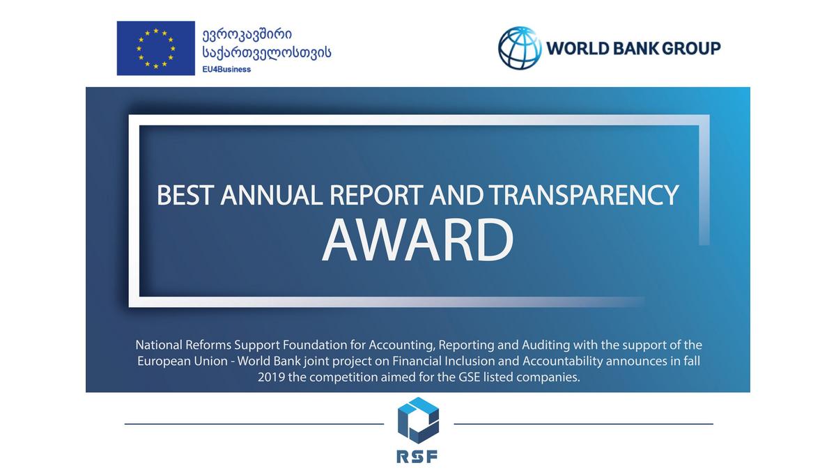 Le succès de l’économie géorgienne dépendra en grande partie de la capacité du secteur privé à attirer des investisseurs nationaux et étrangers. La Géorgie occupe une 6ème place enviable dans le classement mondial Doing Business de la Banque mondiale. Mais les marchés des capitaux géorgiens, y compris le marché boursier géorgien, sont sous-développés et nécessitent des mécanismes et des incitations pour stimuler leur croissance. Le Prix du meilleur rapport annuel et de la transparence est en cours de lancement par la Fondation nationale pour le soutien aux réformes (RSF), avec le soutien de l'Union européenne, de la Banque mondiale, de la Bourse géorgienne (GSE), de la Banque nationale de Géorgie, de la Banque européenne de reconstruction et développement (BERD) et autres, afin de promouvoir de meilleures pratiques en matière de production de rapports par les sociétés cotées à la GSE en récompensant les sociétés cotées dont la qualité des rapports est la meilleure. Des pratiques de reporting de haute qualité, conformes à la réglementation et aux meilleures pratiques émergentes à l'échelle mondiale, ont pour objectif de mieux informer et protéger les investisseurs géorgiens et de les encourager à investir dans des sociétés cotées en Géorgie. Cela aidera le GSE à se développer en attirant de nouvelles inscriptions et de nouveaux investisseurs.